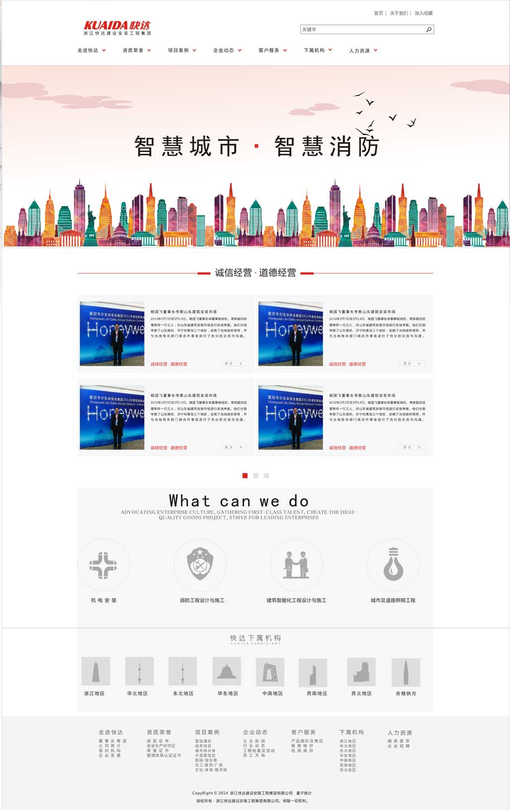 浙江快達建設(shè)安裝工程集團有限公司(原浙江快達安全工程有限公司)是承擔(dān)機電安裝、消防工程設(shè)計與施工、建筑智能化工程設(shè)計與施工的專業(yè)工程公司,具有機電設(shè)備專業(yè)承包壹級、消防設(shè)施工程設(shè)計與施工壹級、建筑智能化工程設(shè)計與施工壹級、安全技術(shù)防范行業(yè)資信等級貳級、城市及道路照明工程專業(yè)承包叁級資質(zhì)。公司在全國各地設(shè)立了20余個分公司或辦事處,并擁有專業(yè)生產(chǎn)火災(zāi)自動報警系統(tǒng)的西安特靈電子有限公司。公司注冊資金7600萬元,員工2000余人,其中高級工程師12名,工程師51名,其它技術(shù)人員200余人;一級建造師15名,二級建造師15名,造價工程師1名,注冊安全工程師2名。目前公司為浙江省消防龍頭企業(yè),浙江省工商行政管理局“守合同重信用”AA級企業(yè),杭州市3A信譽企業(yè)和3A信用等級企業(yè),榮獲"全國安裝先進企業(yè)、"“全國安裝誠信企業(yè)”和“浙江省安裝行業(yè)誠信企業(yè)”等稱號。
